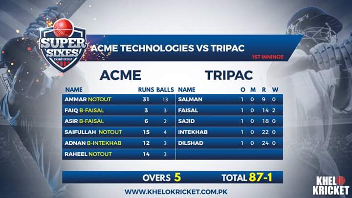 Matches continue and acme marches towards success as they manage to score 80+ in 5 overs and left Tripac questioning their batting abilities. Tripac tried but ended up scoring 20 with the loss of 3 batsmen. Ammar from Acme gave an outstanding performance and scored 31 on just 13 deliveries. The middle batting order faced some trouble but SaifUllah gave a boost up to the scorecard followed by Adnan.